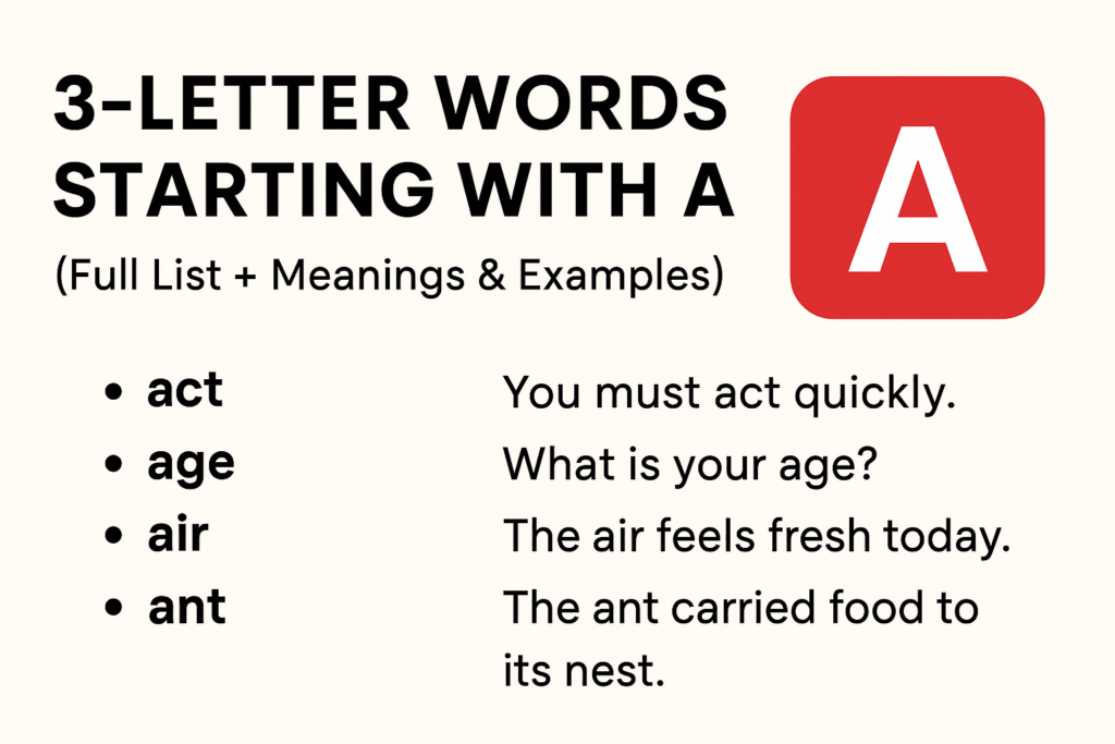Now you have a complete and organized list of 3-letter words starting with A — from everyday vocabulary like act and age to rare gems like ait and aby. Whether you’re polishing your English skills, preparing for word games, or just curious, mastering these short words will give your language ability a real boost.