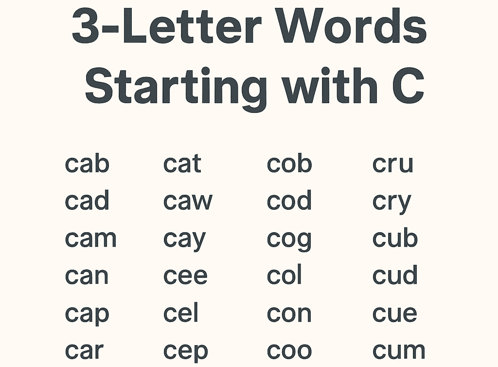 Three-letter words beginning with C are among the most useful in English — you’ll find them in everyday speech (car, cat, can) and in word games where every letter counts (coy, cep, cor).