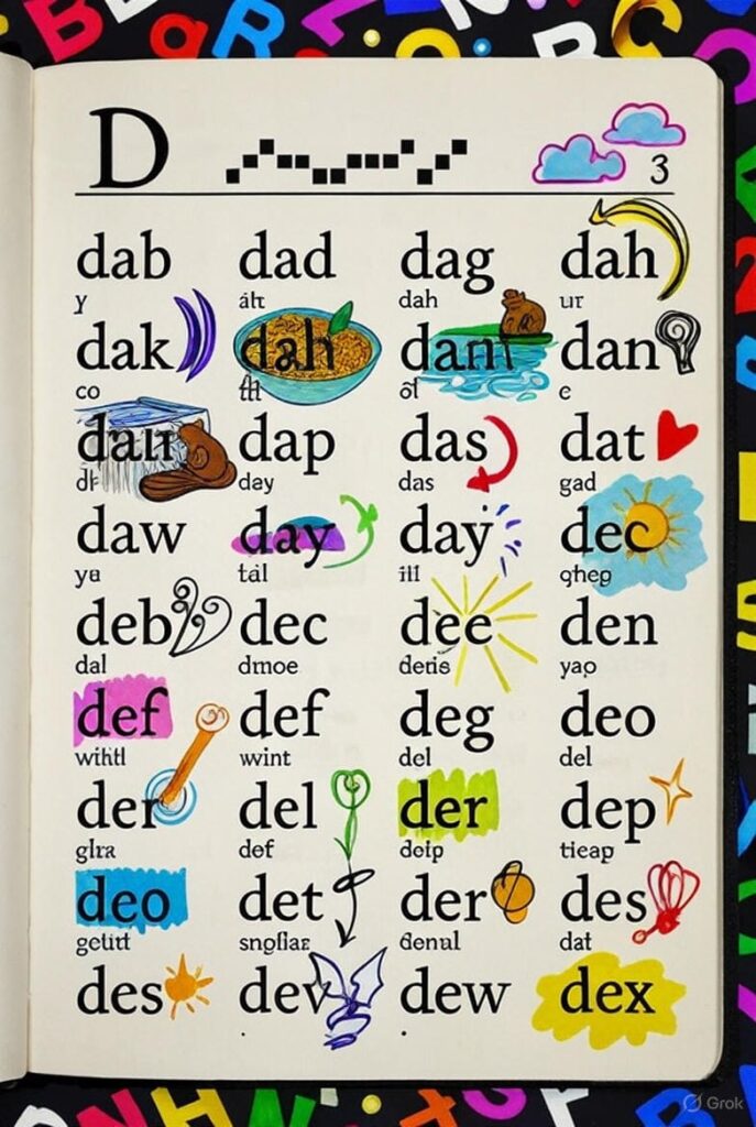 The letter D gives us a diverse set of short, powerful words — from verbs like dig and doe to nouns like den and dew. Let’s explore them all 👇